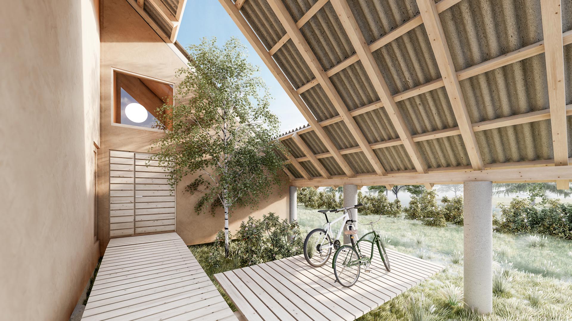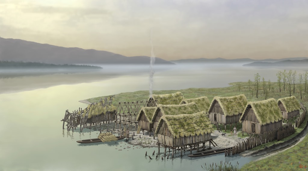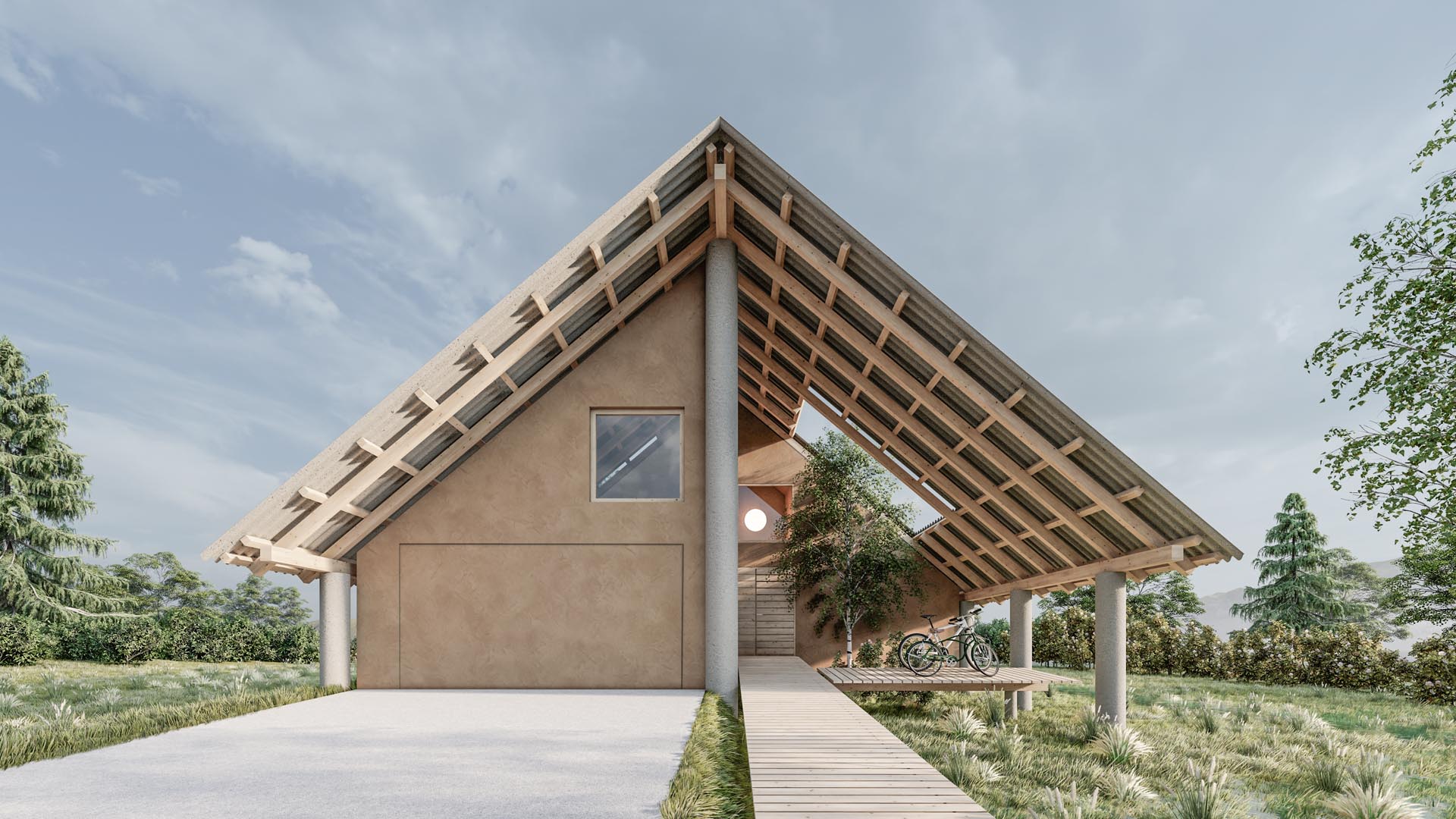 As with the pile-dwelling house, our architecture is marked by simple details. The visible wooden roof structure, concrete load-bearing piles, and natural plaster reinterpret pile-dwelling architecture adapted to modern living guidelines. A respectful upgrade to the dwelling from 4500 years ago.