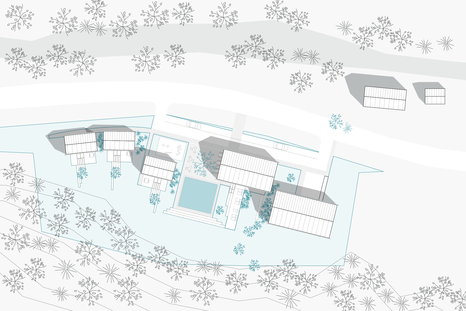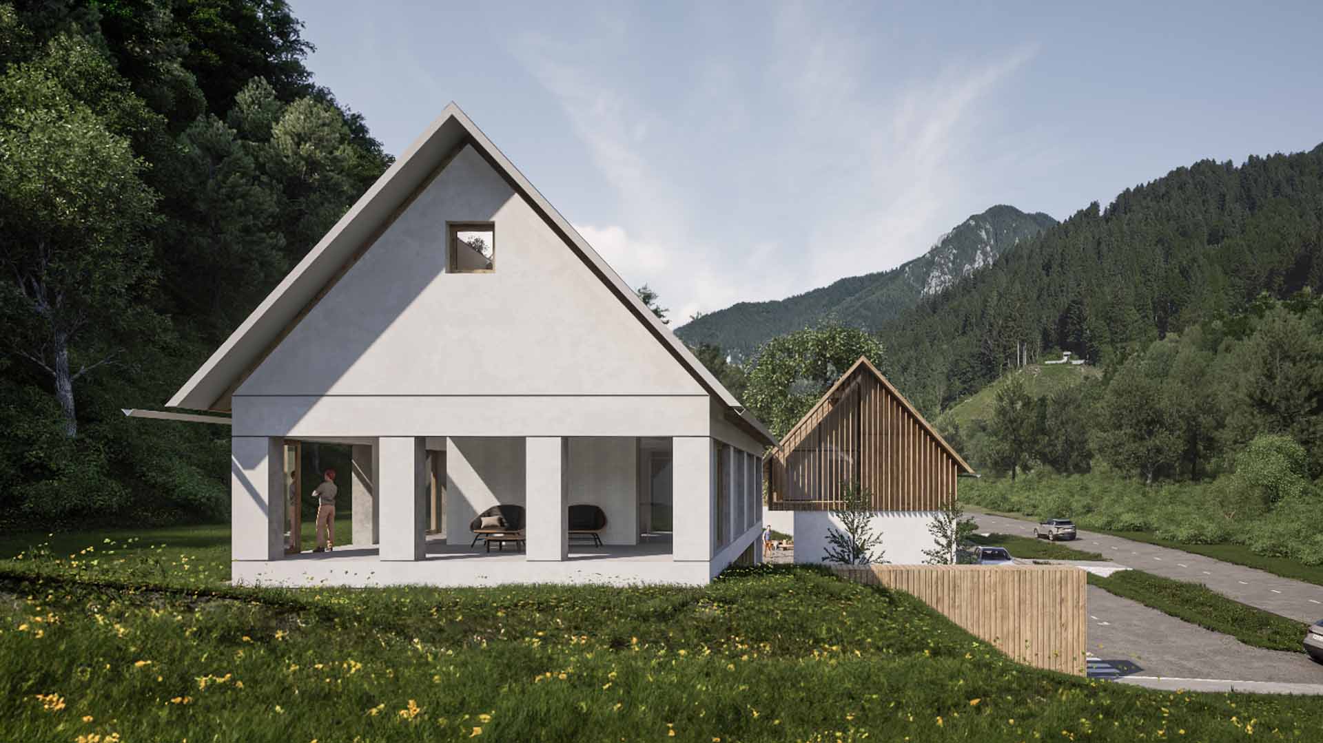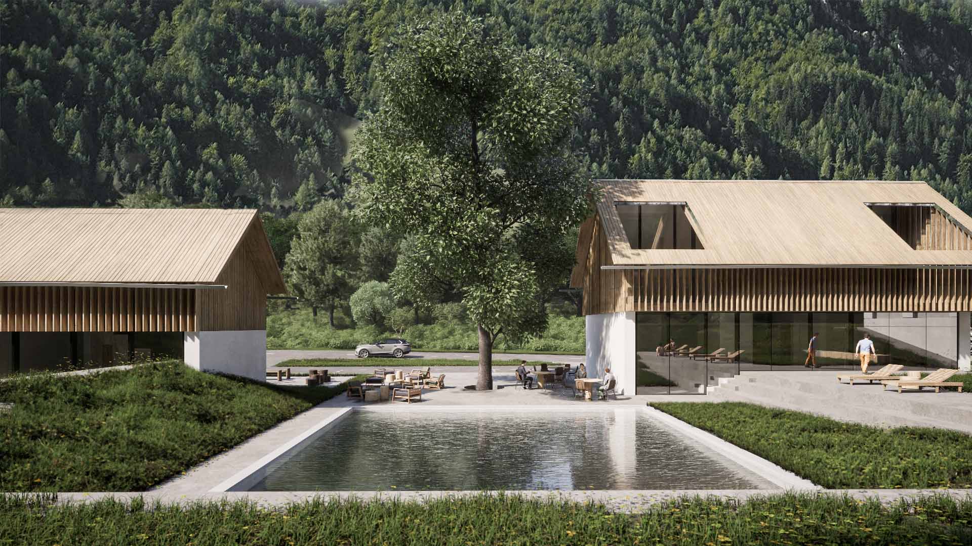 The settlement pattern of the valley typically runs parallel to the Savinja River and consequently, the road. We took this into account, emphasizing the rhythm of the buildings with offsets. These offsets are meant to create intimacy between the structures and position a small square around the linden tree, which extends into a platform with an ecological pool that transforms into a skating rink in the winter. On the side where the buildings have panoramic glazing, we created additional intimacy by modifying the elevation of the terrain.