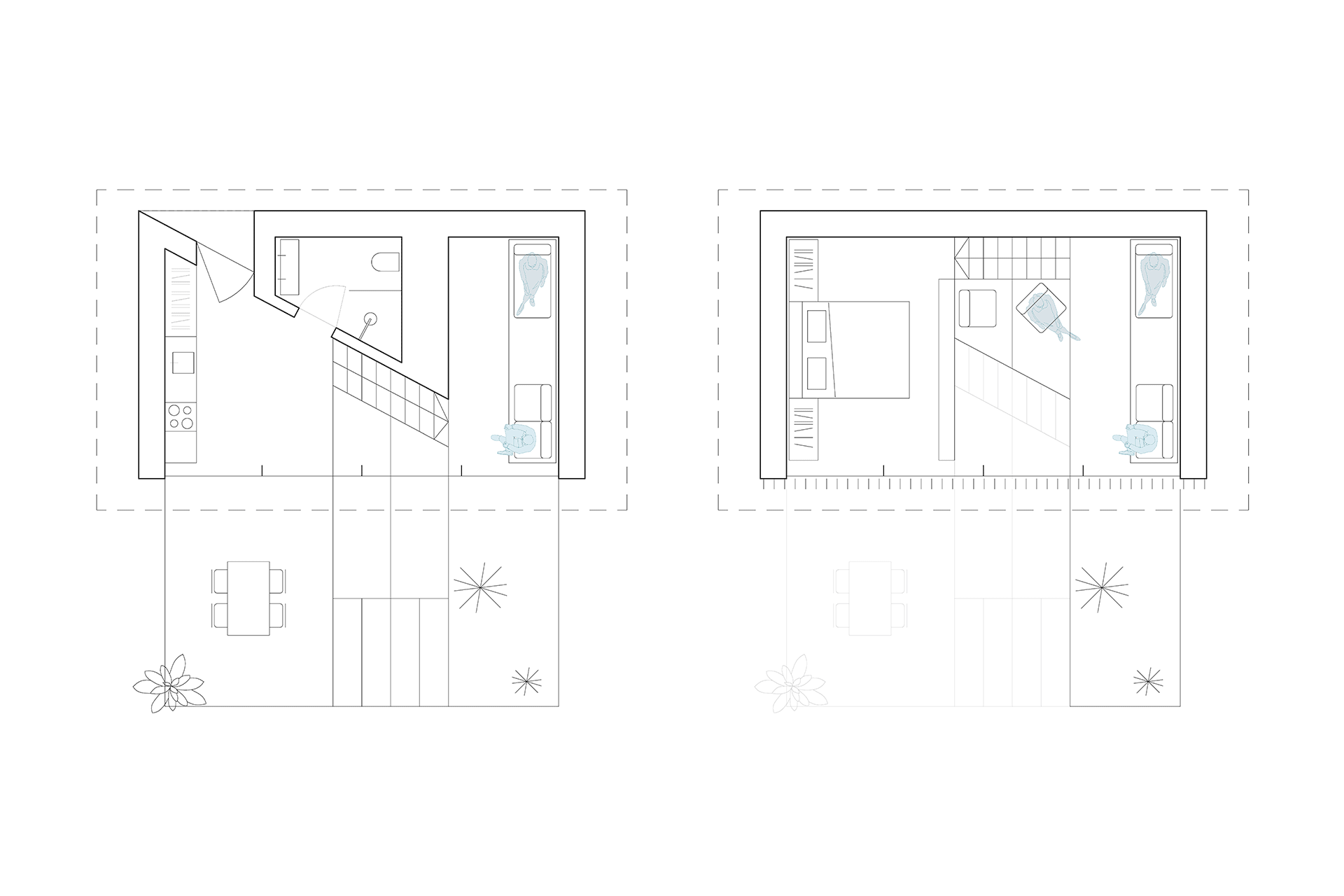 In designing the individual houses, our focus was on introducing natural light into the structures. The residential house has skylights along its entire length, both at the ridge and above the eaves, and its upper floor does not extend to the edges of the house, allowing natural light to freely penetrate. The apartment house "chalet" features two glazed duplex apartments on the upper floor, and its terraces have spaced wooden facades, allowing morning and evening light into the apartments. The three boutique "chalets" have glazing across their entire southern sides, and their interiors are designed as a "loft" around a staircase, which, with its double steps, becomes a space for sitting and socializing.