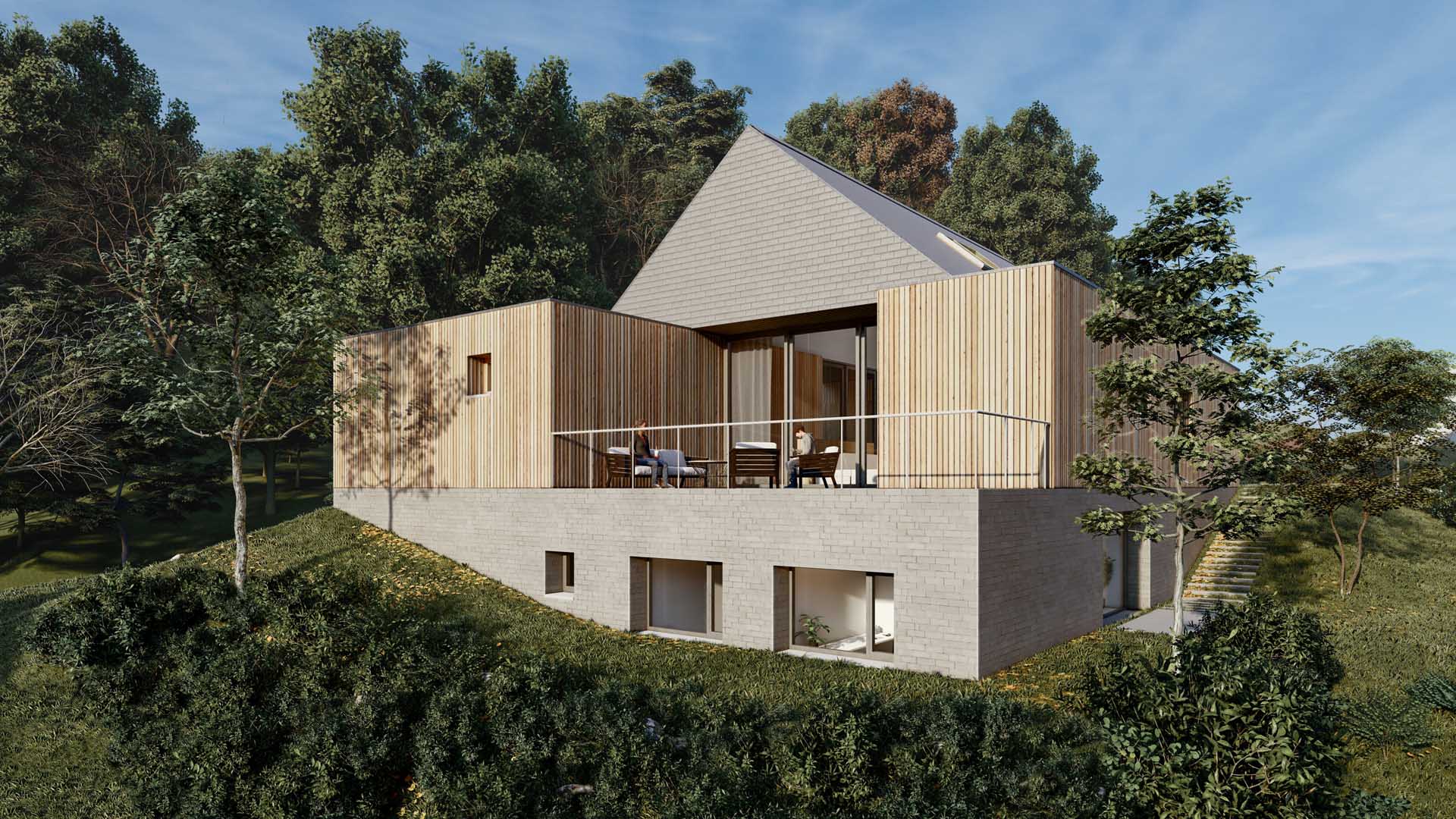 The design of the house is a collection of the client's desires, plot specifics, and the constraints of the surrounding environment. The house for a young family with two children is located at the intersection of the forest edge and the edge of a neighborhood of houses of various styles and shapes. The plot itself slopes, descending towards the neighborhood. The main challenge of the house is to capture southern light and views between neighboring houses while preventing their views into the house. The neighbors, sunlight, and views are all on the same sides of the plot, which gave the house its unique shape.