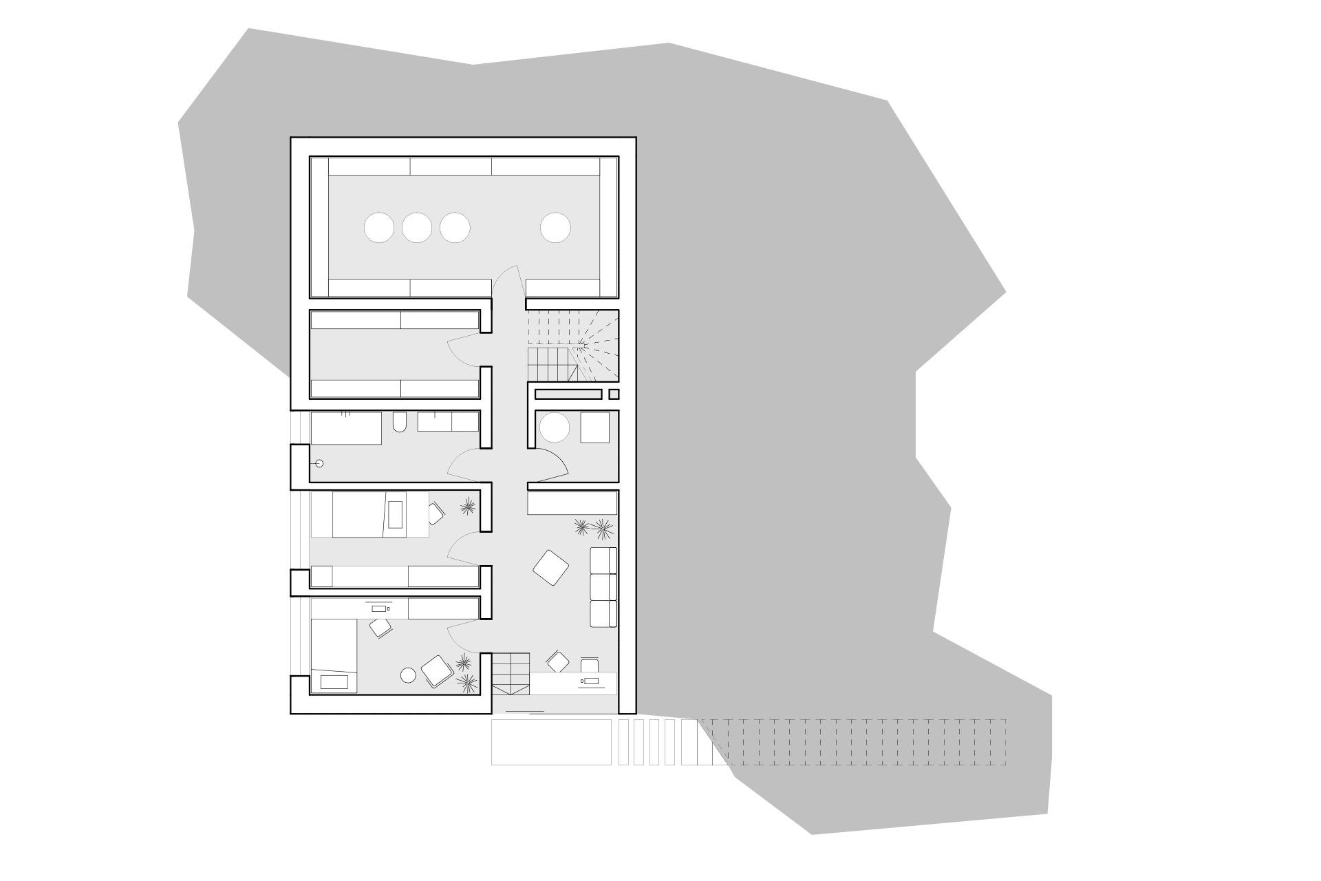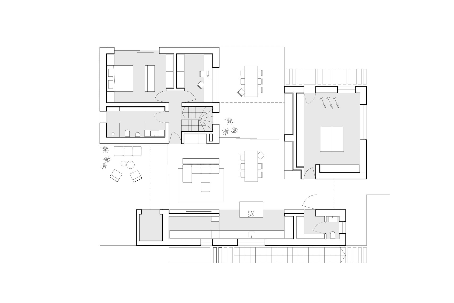 The shape of the house, sloping terrain, and vegetation create intimacy and lure living spaces beyond their frames.