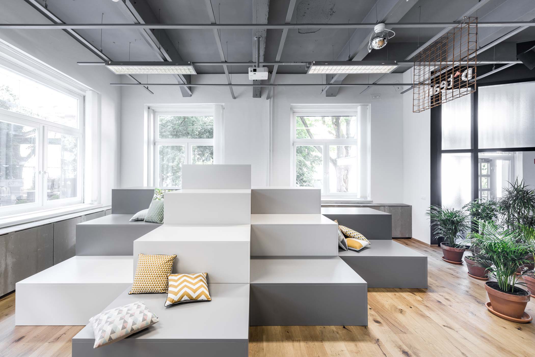 In consultation with the client and the employees, we developed a hybrid office: traditional "closed" offices intertwined with open "coworking" offices. For a comfortable work environment, we covered the floors with an oiled, creaky wooden floor, a kitchen that doubles as a bar, and a spacious auditorium for socializing and presentations. The entire open area can transform into a "mini-disco" for afternoon "after work" socializing with the help of a kitchen island that turns into a DJ booth. The plants, taken care of by the employees, contribute to their sense of belonging. The bookshelf is filled with content that provides a break from the screen, a punching bag for relaxation, and a micro-office under the auditorium for a break from the "coworking" space. As the company is growing rapidly, we have foreseen the possibility of expanding current employee capacities by 30% within the existing premises.