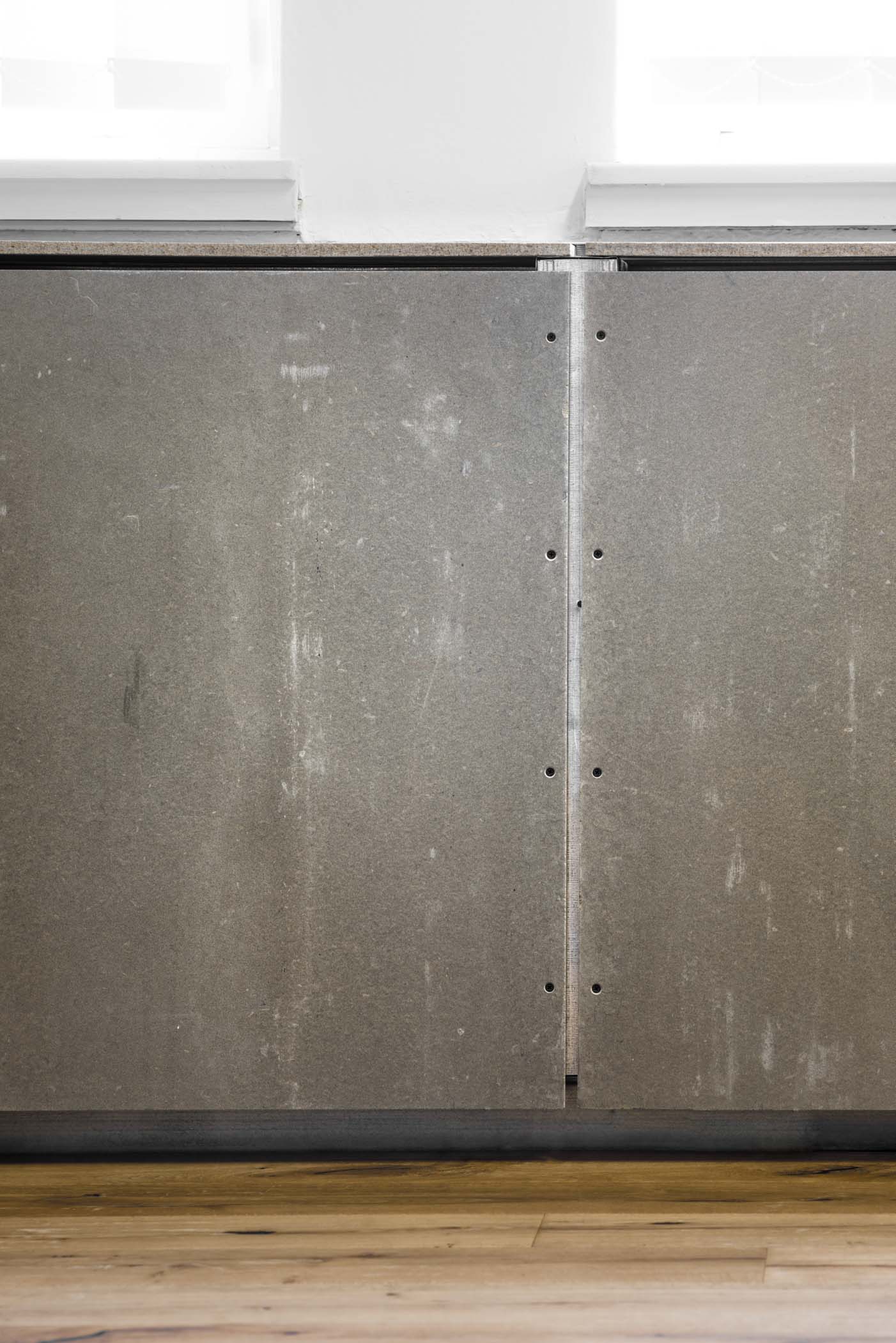 The offices are rented, so we recycled to rationalize renovation costs: we removed the gypsum cardboard panels from the ceiling, but kept the structure that serves as a network for the distribution of installations, lights, hanging of the projection screen, disco ball, etc. Thus, the grid has become a strong design element of industrial appearance. We used the remnants of the gypsum cardboard panel structure to make window sill shelves that hide radiators and cabling for workplaces, which we then closed with construction panels. Rusty reinforcing grids with inscriptions are an extension of this idea.