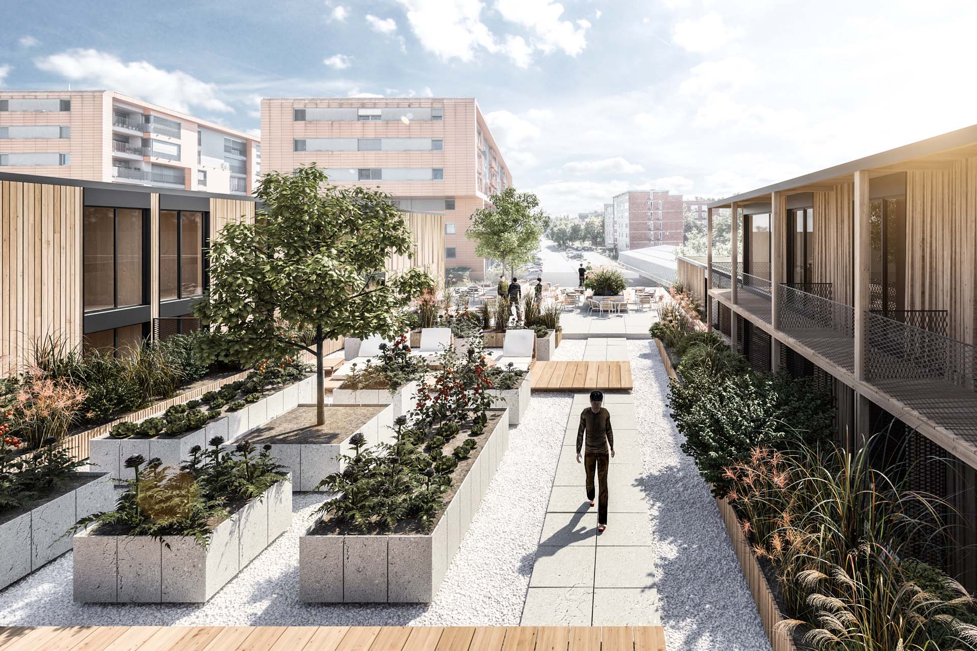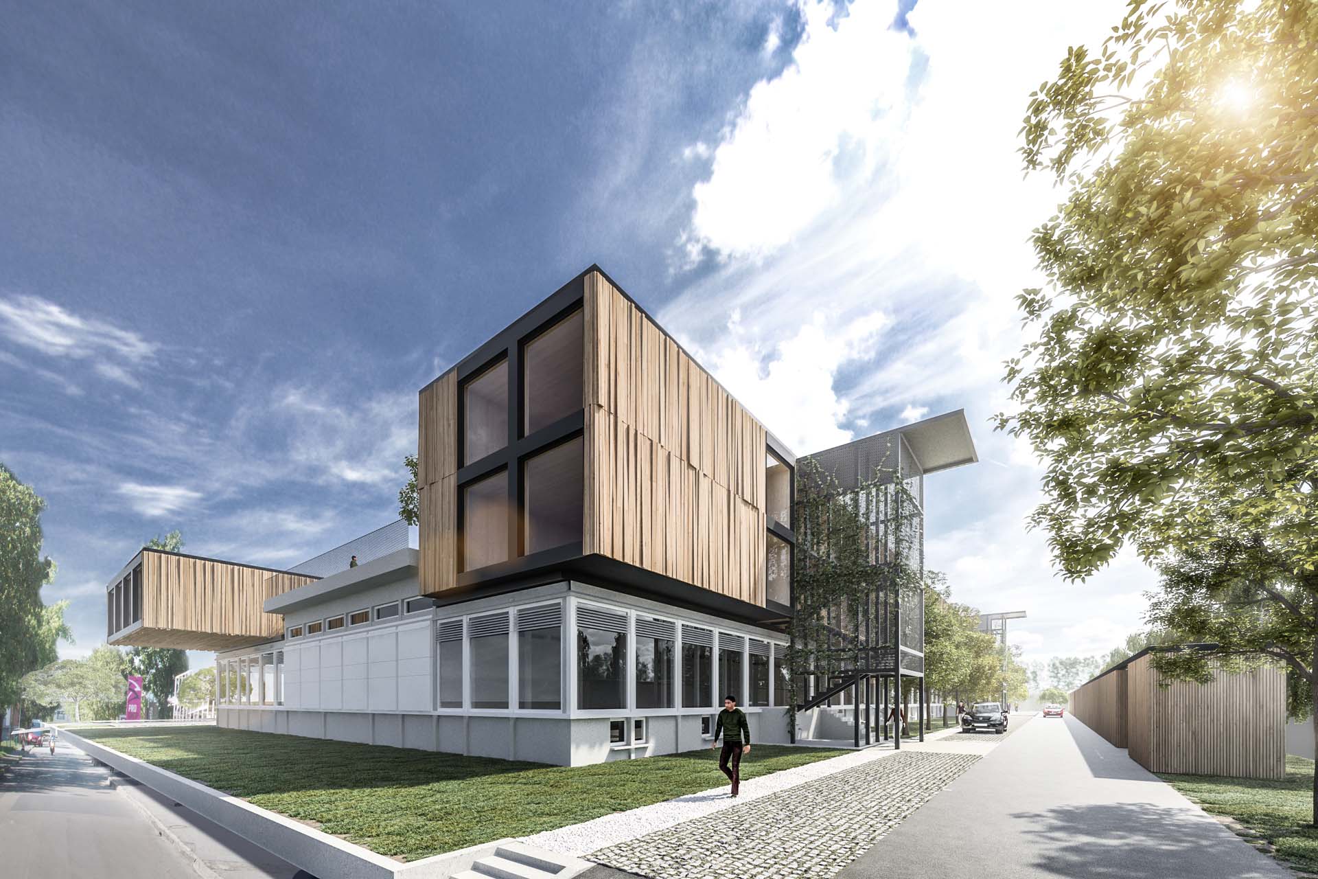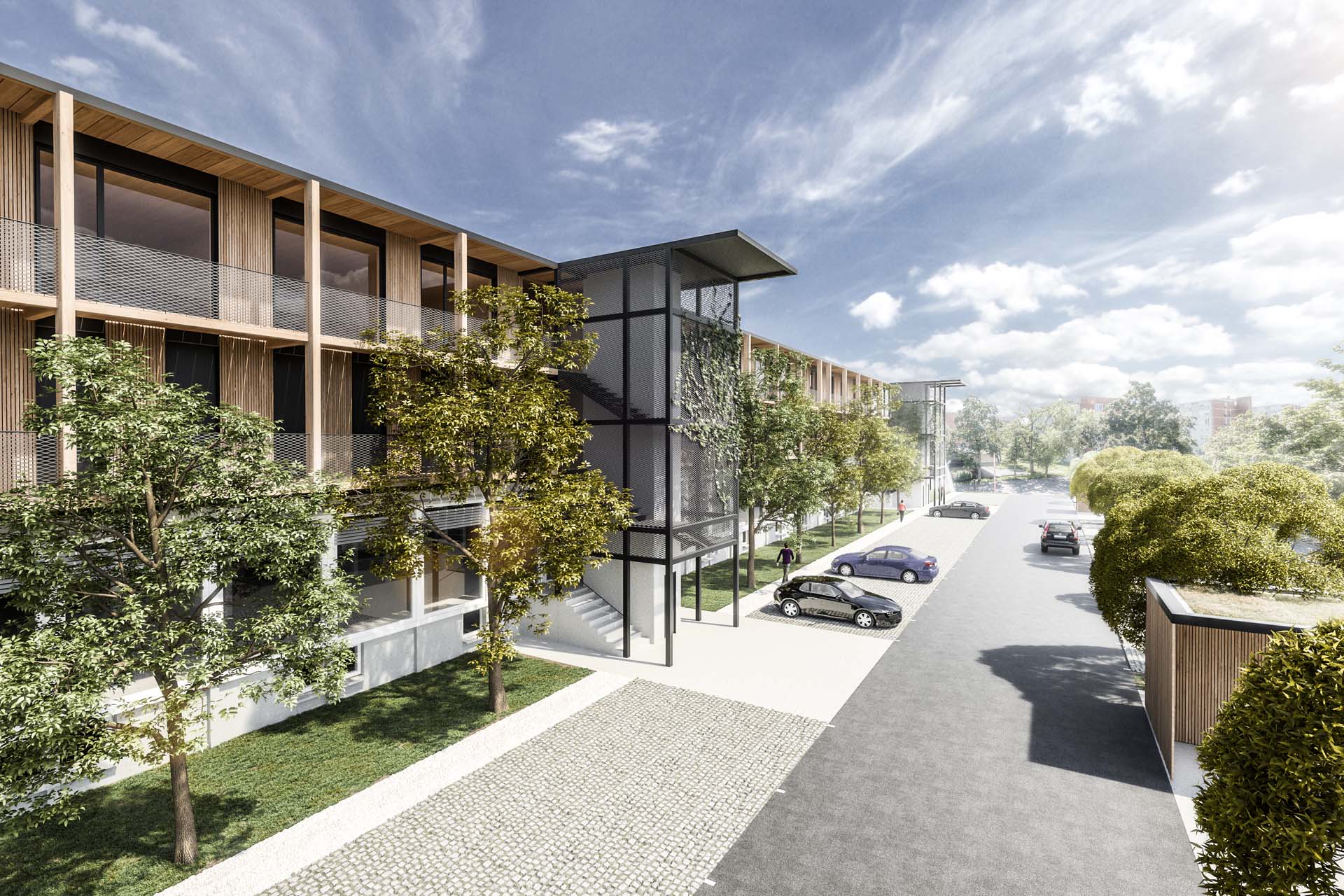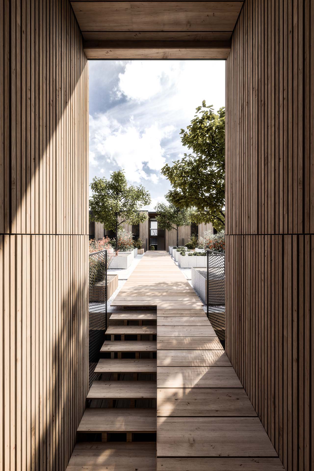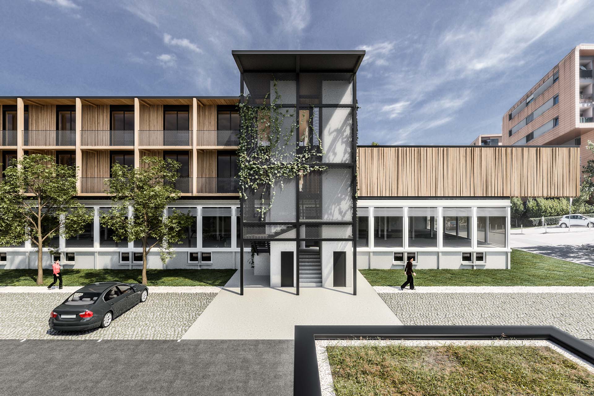 MS residential and commercial building BASIC INFORMATION Project: Location: Client: Year: Area: Authors: Typology: Photo/Viz: existing ground floor is upgraded with a light wooden structure, emphasized by a wooden facadea steel core surrounded by greenery indicates the entrance to the buildingentrances to the duplex apartments are from the lower balcony - porchurban park on the roof allows for small gardens and creates a dynamic and colorful ambiancewooden access to the terracewood inside creates a pleasant touch, view, and feelinggreenery in the roof park provides a relaxing view and fresh air DESCRIPTION Text in preperation CONCEPT, PLANS