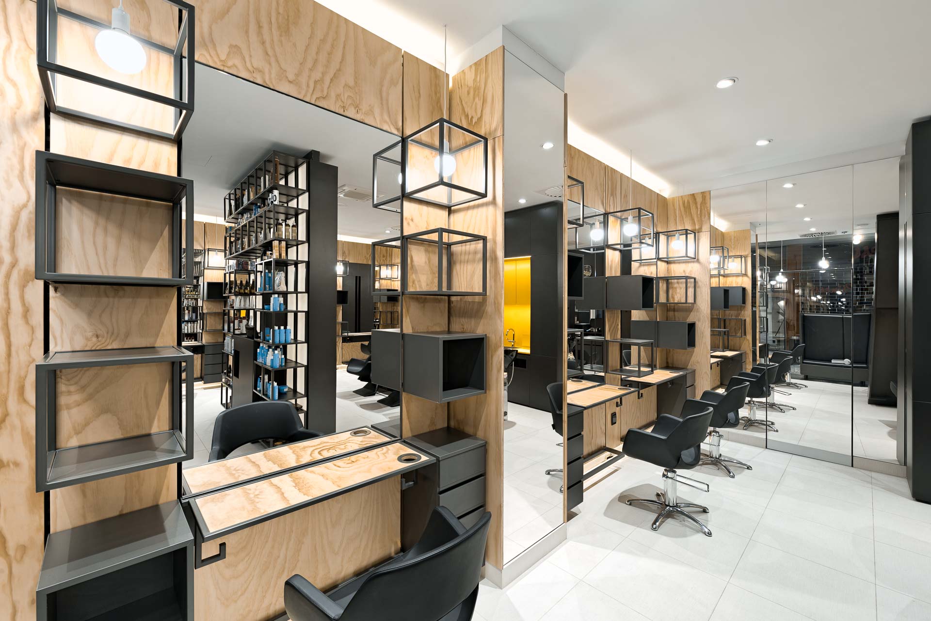 V prostor kvadratnega tlorisa smo v sredino postavili prodajno steno z blagajno, ki zastre pogled na umivalnico las. Svetleča prodajna stena, osvetli produkte in pritegne pozornost mimoidočih. Na obodne stene smo namestili 6 delovnih mest, čakalnico postavili v izložbo in tako ustvarili večjo zasebnost strank pri striženju.