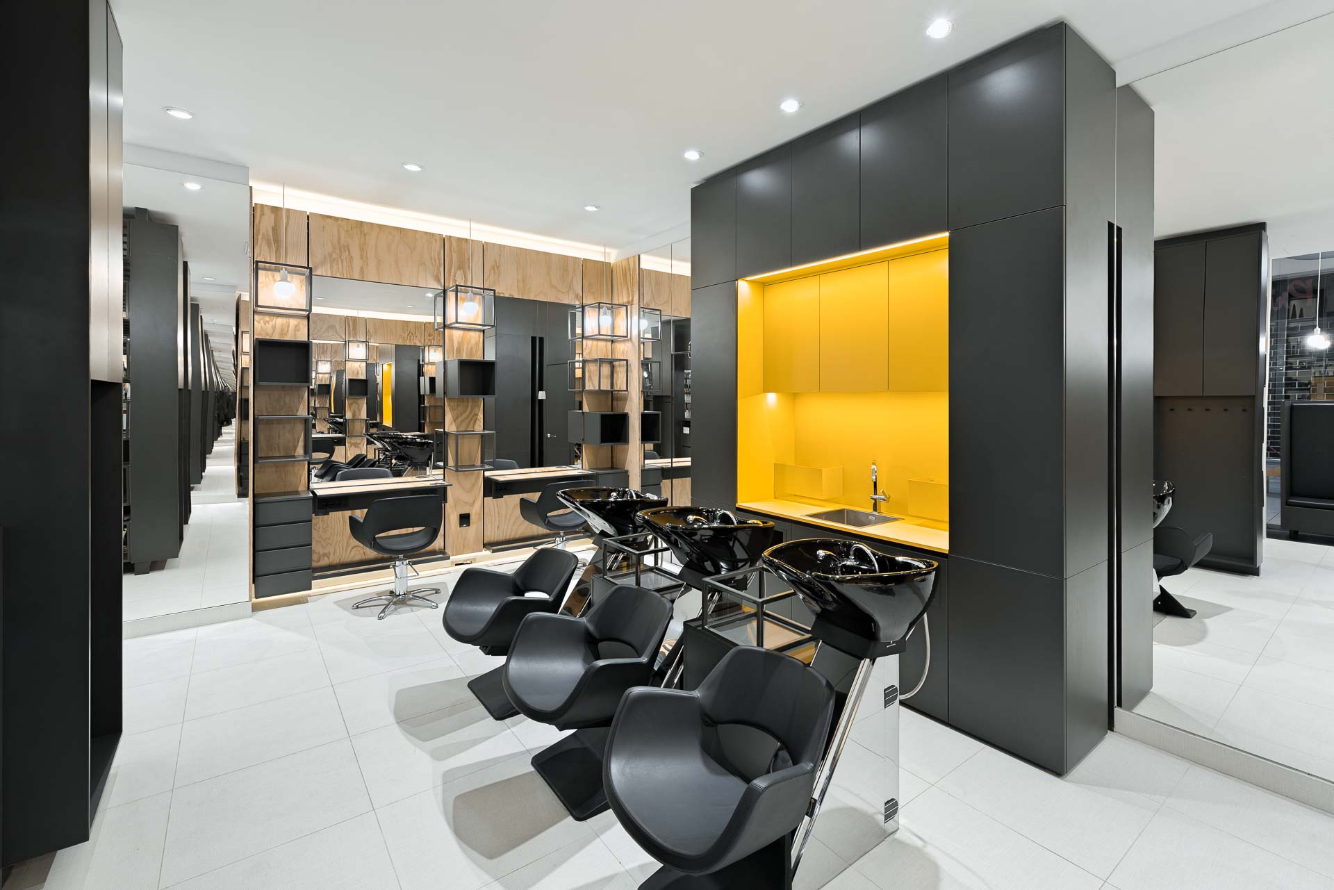 Na ta način se prilagaja na potrebe uporabnika (nastavljiva višina in pozicija posameznih elementov). Vso pohištvo je odmaknjeno od tal in tako omogoča hitro in enostavno čiščenje. Velika ogledala na hrbtni steni salona, vizualno povečajo in osvetlijo prostor. Kvaliteta prostora se kaže v dobri osvetlitvi, ki pravilno osvetli stranko v obraz in lasišče.