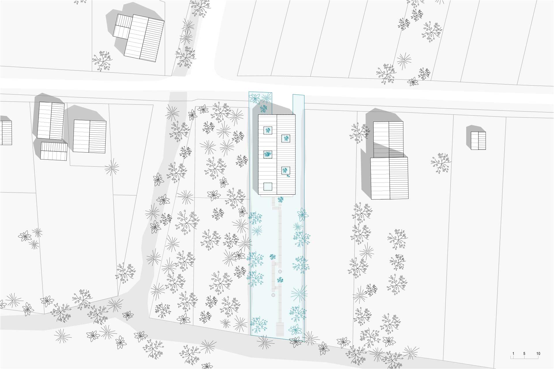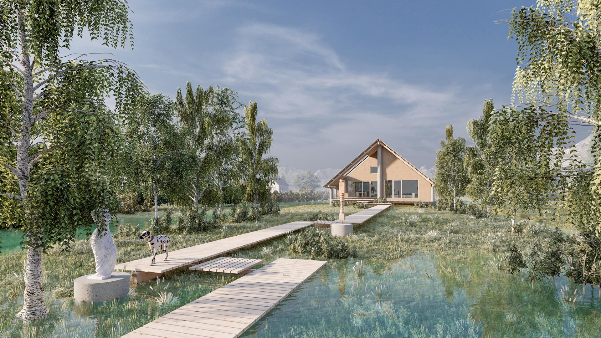 Podobno kot koliščarji smo hišo preko pilotov dvignili od tal. Ob poplavah zato ne bo strahu pred vodo in temu sledijo tudi dvignjene poti po nezazidljivem delu parcele, ki smo ga oblikovali kot park z lokalno vegetacijo. Lastnika sta zbiratelja umetnosti, predvsem skulptur, zato se pot po parku zamika, zamike pa izkorišča za razstavljanje skulptur. Zaradi intenzivne poselitve barja v prihodnosti pričakujemo novogradnje na obeh straneh hiše. Zagotavljanje intime smo dosegli z okenskimi površinami orientiranimi v atrije. Glavnina pogledov iz prostorov je tako skozi atrije usmerjenih v nepozidan del naše parcele.