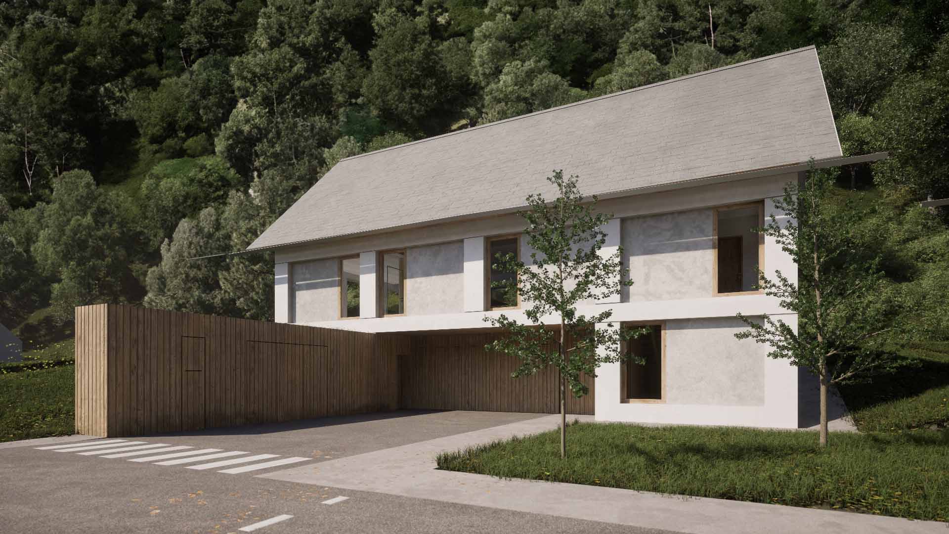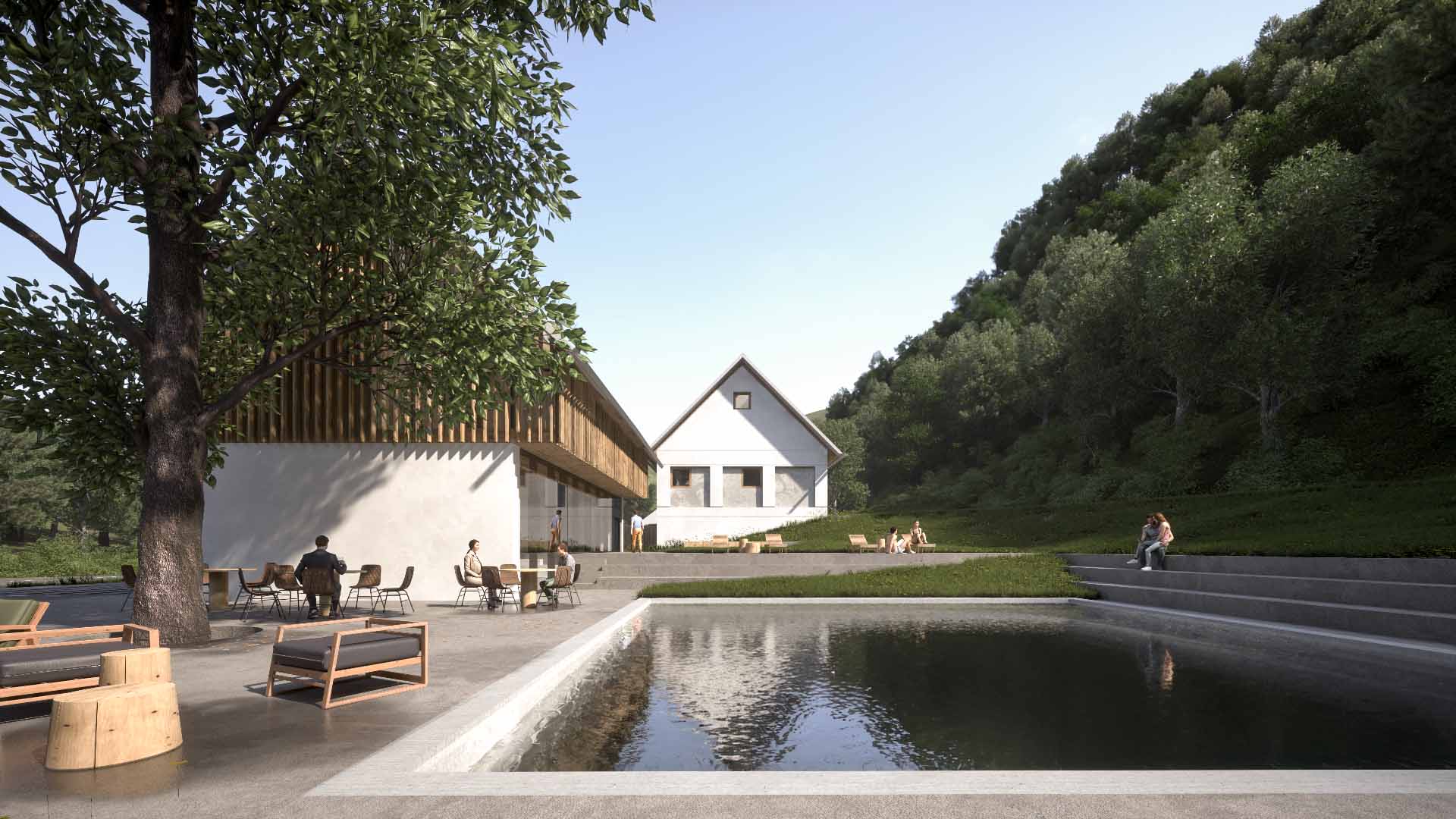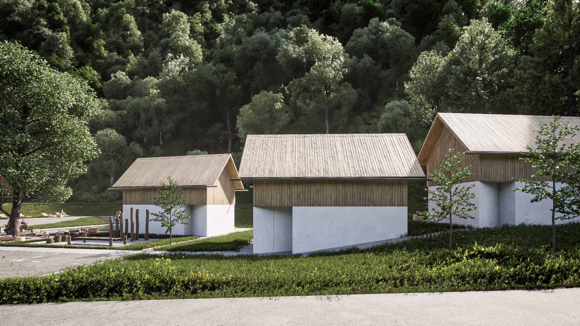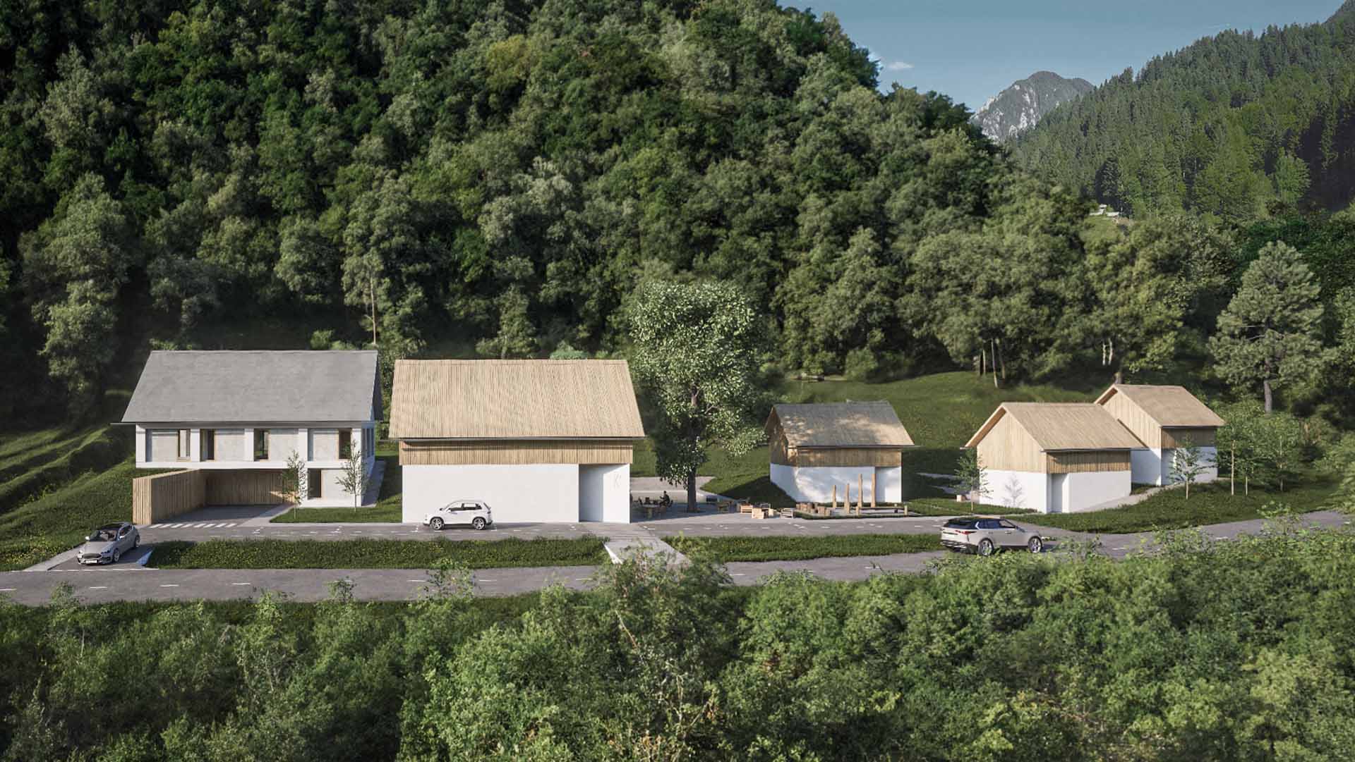 Vzorec poselitve doline je tipično vzporeden z reko Savinjo in posledično tudi s cesto. To smo upoštevali in ritem objektov poudarili z zamiki, ki služijo ustvarjanju intime med objekti ter umestitvijo manjšega trga z lipo, ki se razteza v ploščad z ekološkim bazenom, ki se pozimi spremeni v drsališče. Na strani, kjer imajo objekti panoramske zasteklitve, smo z višanjem in nižanjem terena ustvarili dodatno intimo.